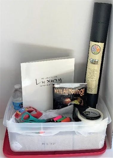 *This example includes a marketing folder, a book for the kids, packing tape, scissors, bottled water, and marking pens in a convenient box your clients can keep on hand while packing. It’s a great way to store their moving supplies—and affixing your branding would make it even better!