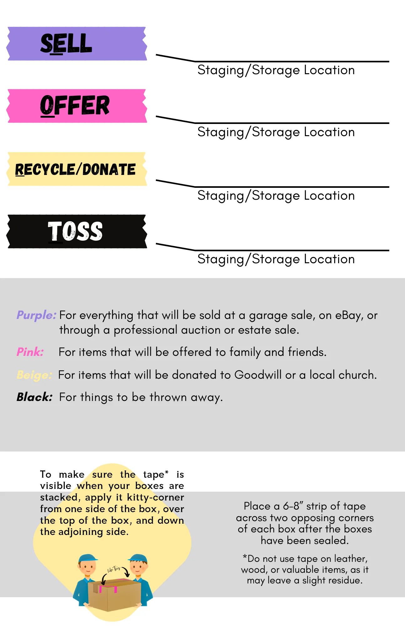 Say goodbye to the stress and confusion of trying to organize belongings. With Downsizing Magic you'll receive four vibrant colored rolls of tape and four handy signs to place in specific collection areas. Whether you're sorting out boxes or furniture, our system helps you make clear and quick decisions. Plus, with our easy-to-follow instructions, your clients will be organization pros in no time! Whether you're a REALTOR®, senior move manager, family member, or the soon-to-be mover, this one simple step will help move you forward with ease, working towards a common goal.